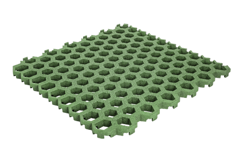 Gum-tech® produces two complementary systems — Puzzle Mat 3D® and Grass Grid Hexagon® — that share key performance characteristics. Both are made from controlled recycled rubber streams and verified raw materials, resulting in a documented carbon footprint of 624 g CO₂e per kilogram. In addition, both systems contribute to environmental goals through full surface permeability, enabling natural water infiltration and reducing runoff.